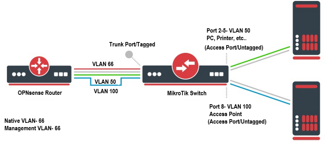 In this lab, we will utilize the cool feature of traffic tagging on Opnsense and MikroTik devices.