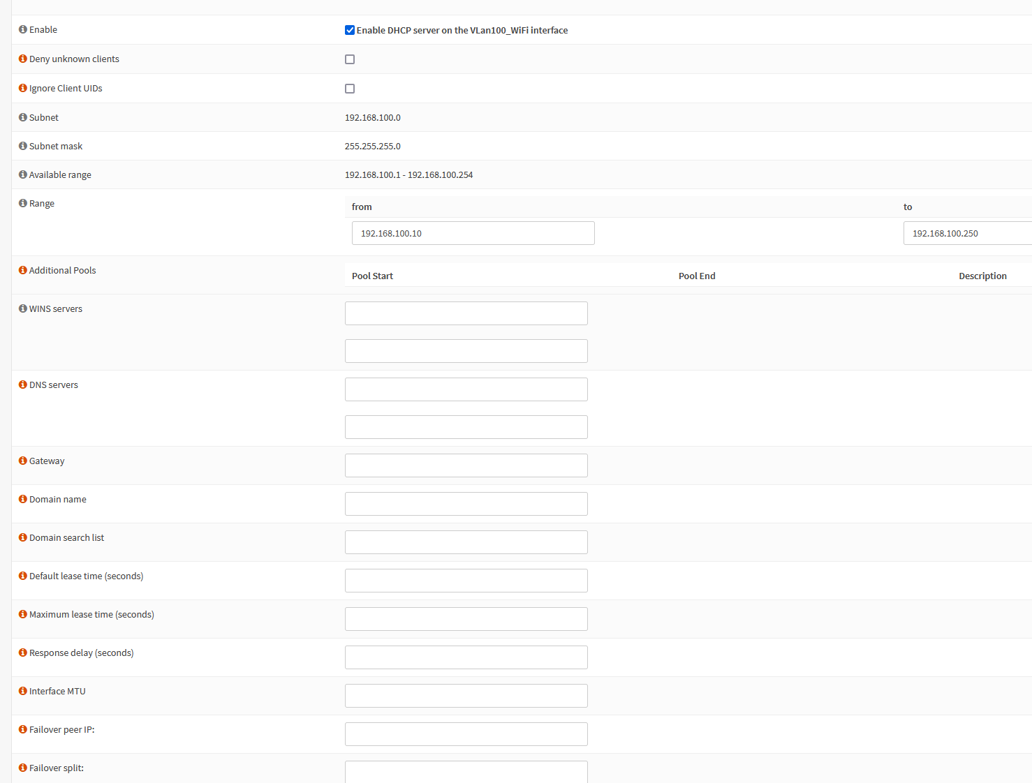 Set your DHCP range and DNS address. I suggest configuring unbound DNS later to use Quad9 nameserver so leave the DNS field empty.
