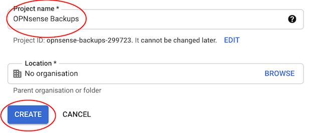 On the next page enter a name for your project, for example “OPNsense Backups”. You may leave it as the default name (“My Project #####”), as it does not really matter. Then click on the CREATE button: