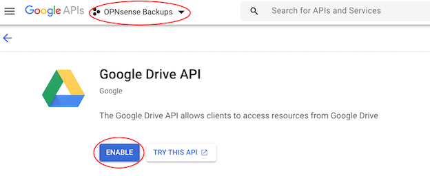 On the next page, make sure your project name (for example “OPNsense Backups”) is displayed at the top of the page – if not, select it in the dropdown. Then click the ENABLE button: