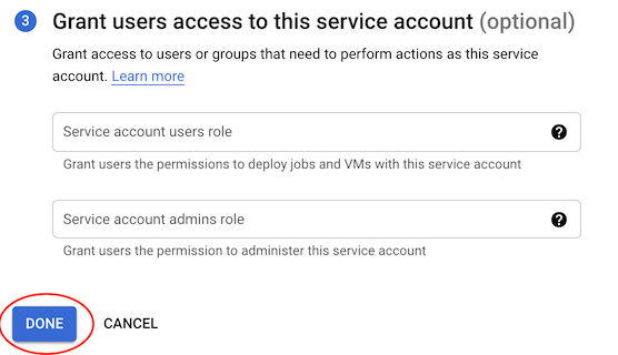 On the next page, take a note of the email address for your new service account – you will need it later. Then click on the three vertical dots under the Actions heading for your service account, then click on Create key: