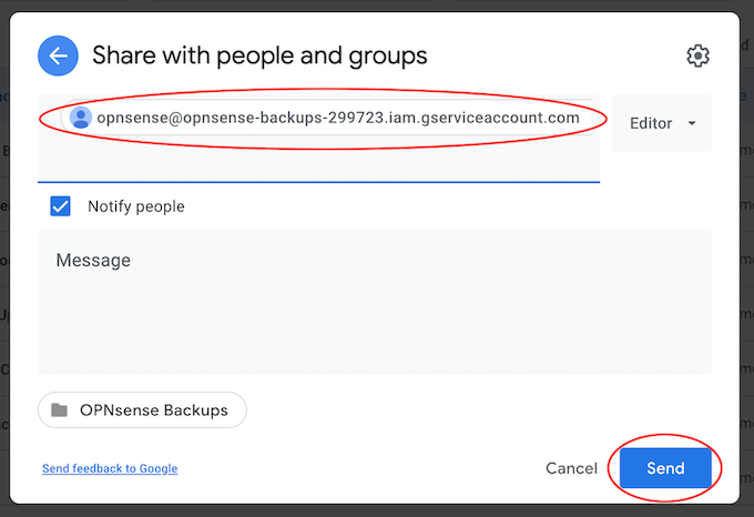 Paste the email address for the service account into the “Add people and groups” box, press Enter and then click the Send button that appears: