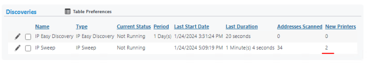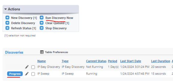 Make sure the SNMP string for the printers matches what is in Discovery > SNMP (Get and Set). To run now, check the box by the discovery, and click Run Discovery Now. The Status changes from Not Running to Running and a Progress button appears.