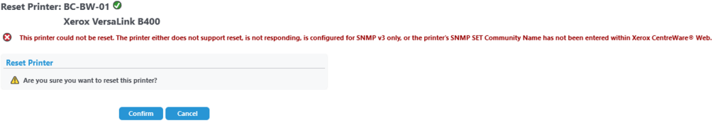 If Admin is unable to reset the printer with the following error:
