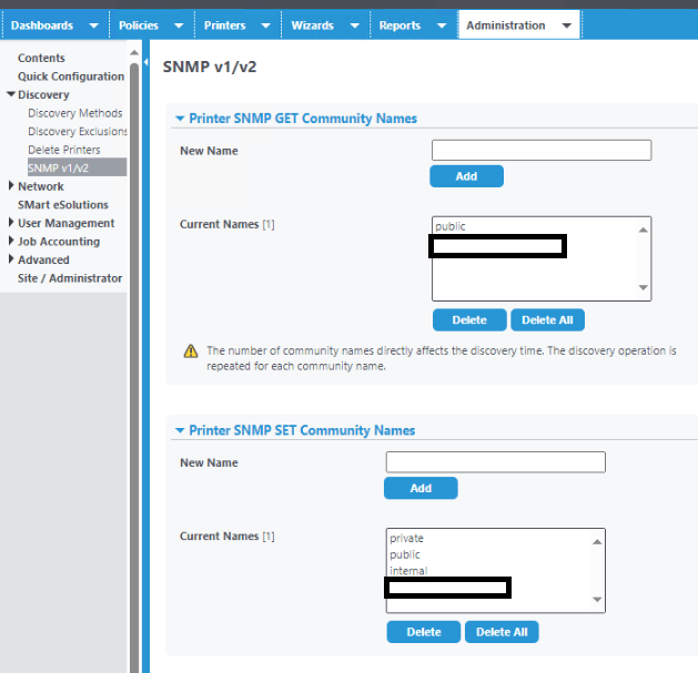 - Go to administration > Discovery > SNMP v1/2 > input device SNMP string of device.