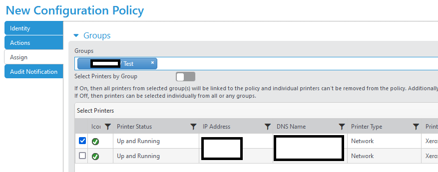 7. Assign to a group [If admin want to apply policy per printer– turn off Search printer by group]