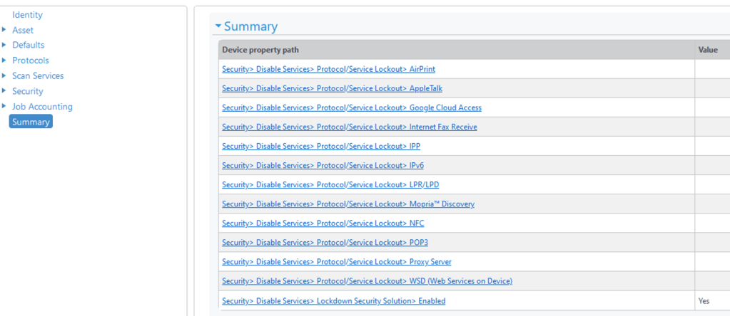 - The following policy [Disable Protocol] will lock down printer and prevent users from making any changes.