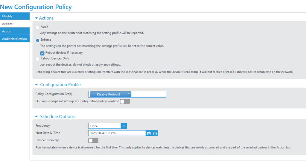 - Actions > Enforce (to deploy). Select configuration set that was created before [Disable_Protocol]
