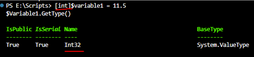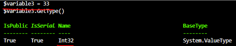 $variable2.GetType() #The method returns the properties of the variable as an integer32, if result shows double (it refers to decimal)#