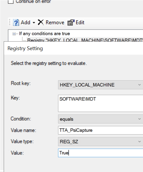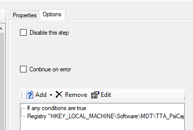 3. For the second step, which is the application install – modify the option to ONLY execute IF the registry values are met in the script (New-ItemProperty -Path “$RegKey” -Name “TTA_PsiCapture” -Value “True” -PropertyType String -Force -Verbose).
