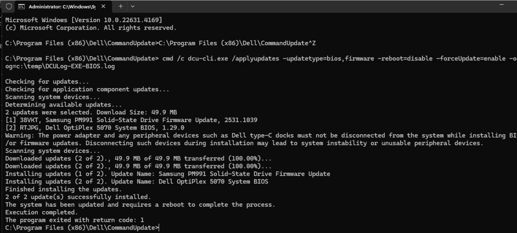 $command = "/applyupdates -updatetype=bios,firmware,driver,application -reboot=disable -forceUpdate=enable -outputlog=c:\temp\DCULog-EXE-BIOS.log "